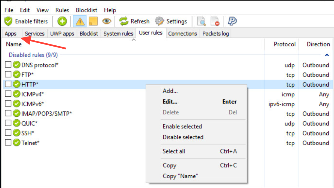 Step 4: To manage specific applications, navigate to the "Apps" tab in SimpleWall. Here, you will see a list of applications attempting to access the internet. Beside each application, you can toggle between "Allow" and "Block" to set your preferred access rules.