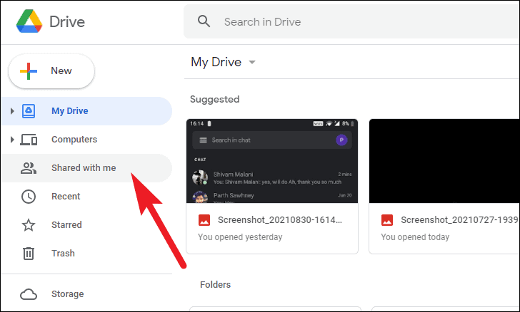 Once you are logged in, locate and click on the ‘Shared with me’ tab from the left sidebar present on the webpage.