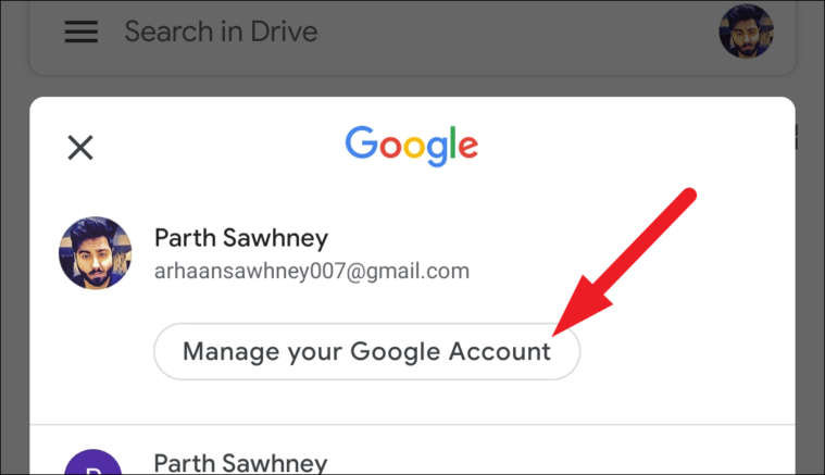 Next, tap on the ‘Manage your Google Account’ option present on the overlay pane. This will bring up an overlay window on your screen.