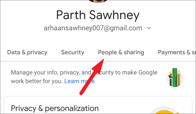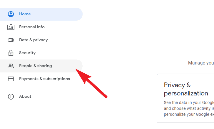 Now, from the ‘Google Account’ tab locate and click on the ‘People & sharing’ option from the left section of the screen.