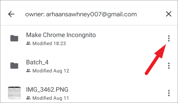 You will now be able to see all the items shared with you by the specified owner in a list on your screen. Now, tap on the ellipsis (three vertical dots) present on the far right edge of each item. This will open up an overlay menu on your screen.