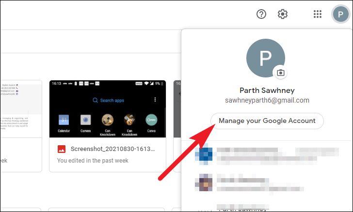 Once logged in, click on your profile account picture or initials and click on the ‘Manage your Google Account’ button. This will redirect you to a new tab.