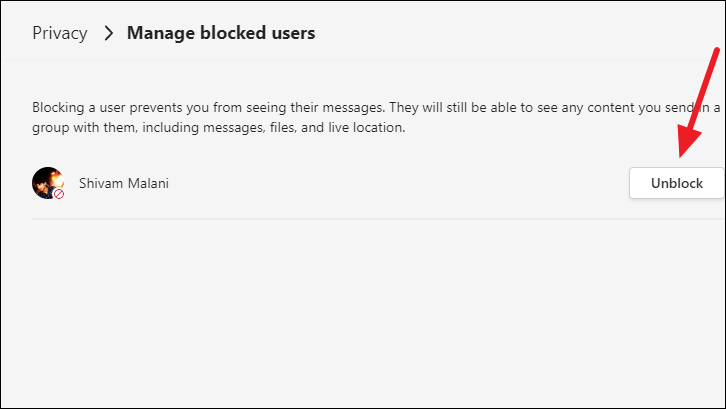 Find the contact you want to unblock and click the ‘Unblock’ option.