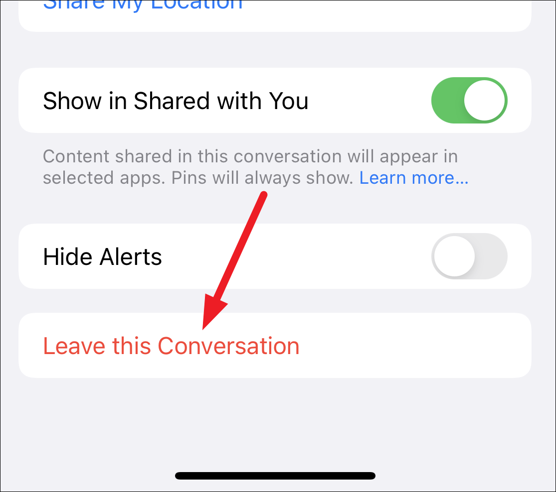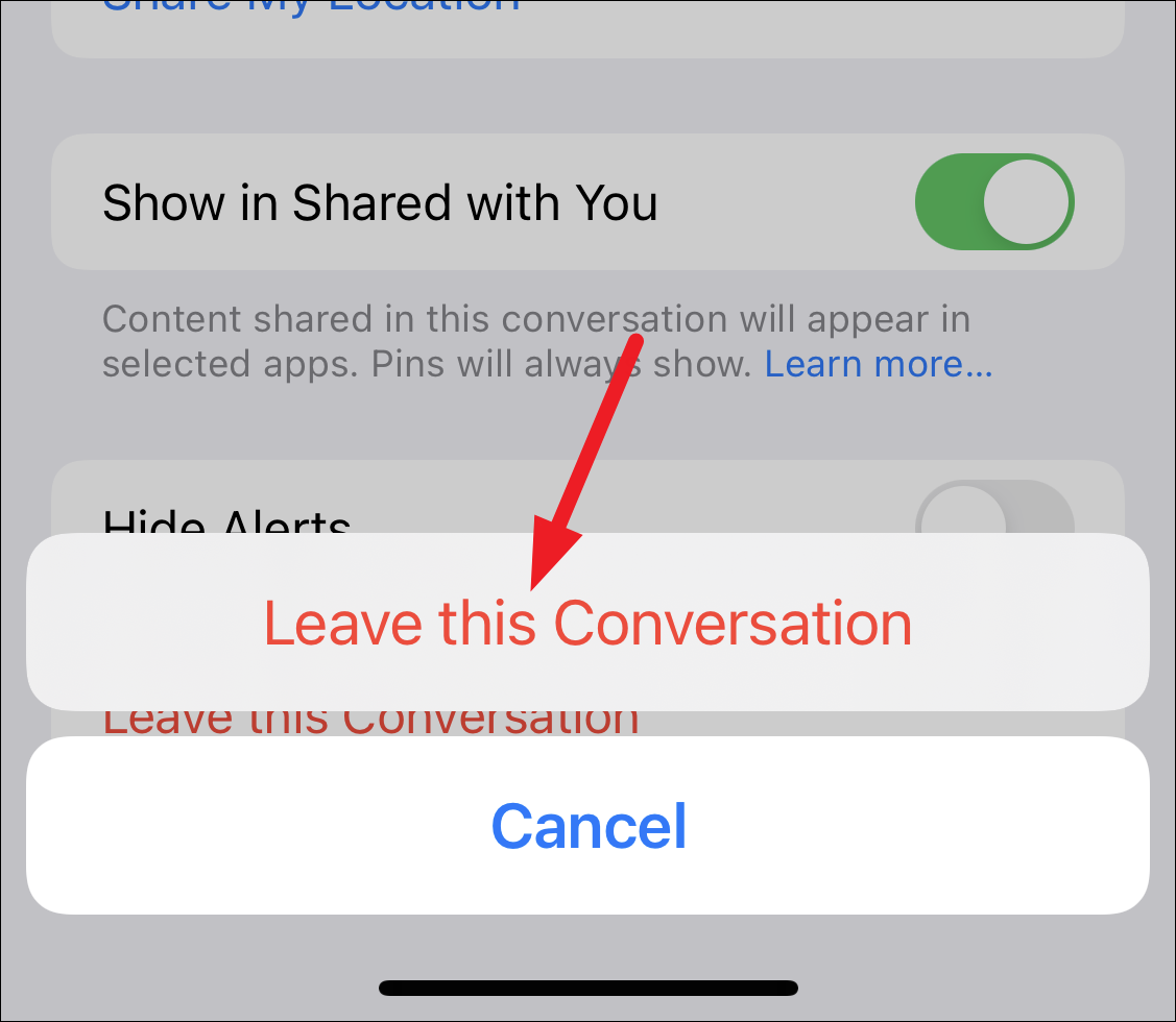 Then, scroll down and tap ‘Leave this Conversation’ at the bottom.