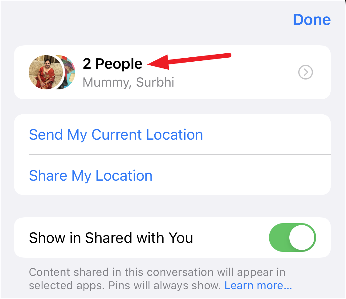Open the group chat and tap the ‘People’ icons at the top. Then tap the ‘N People’ option to expand the list of people in the group.