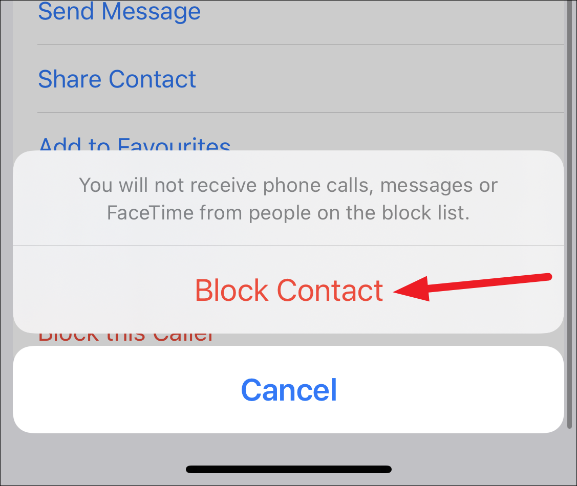 A confirmation prompt will appear. Tap ‘Block Contact’ to confirm your action.