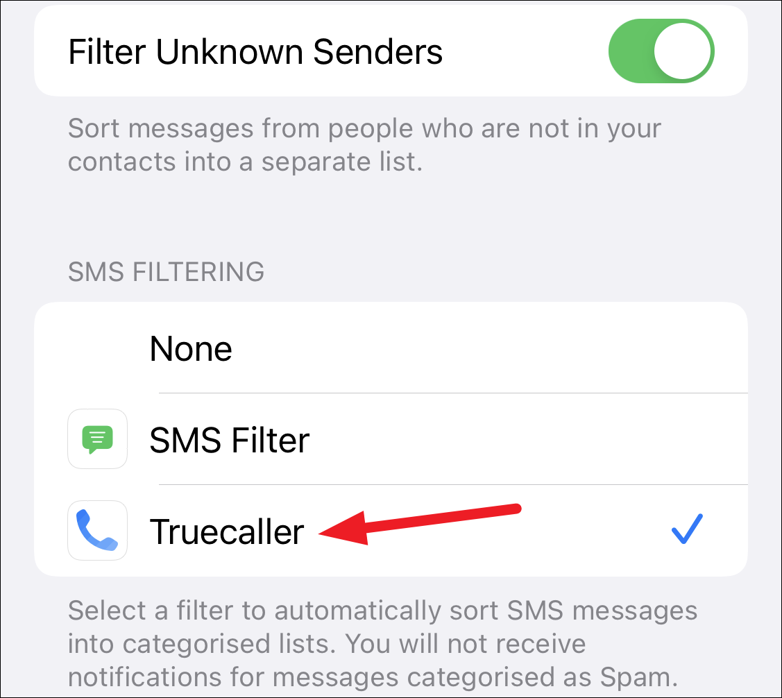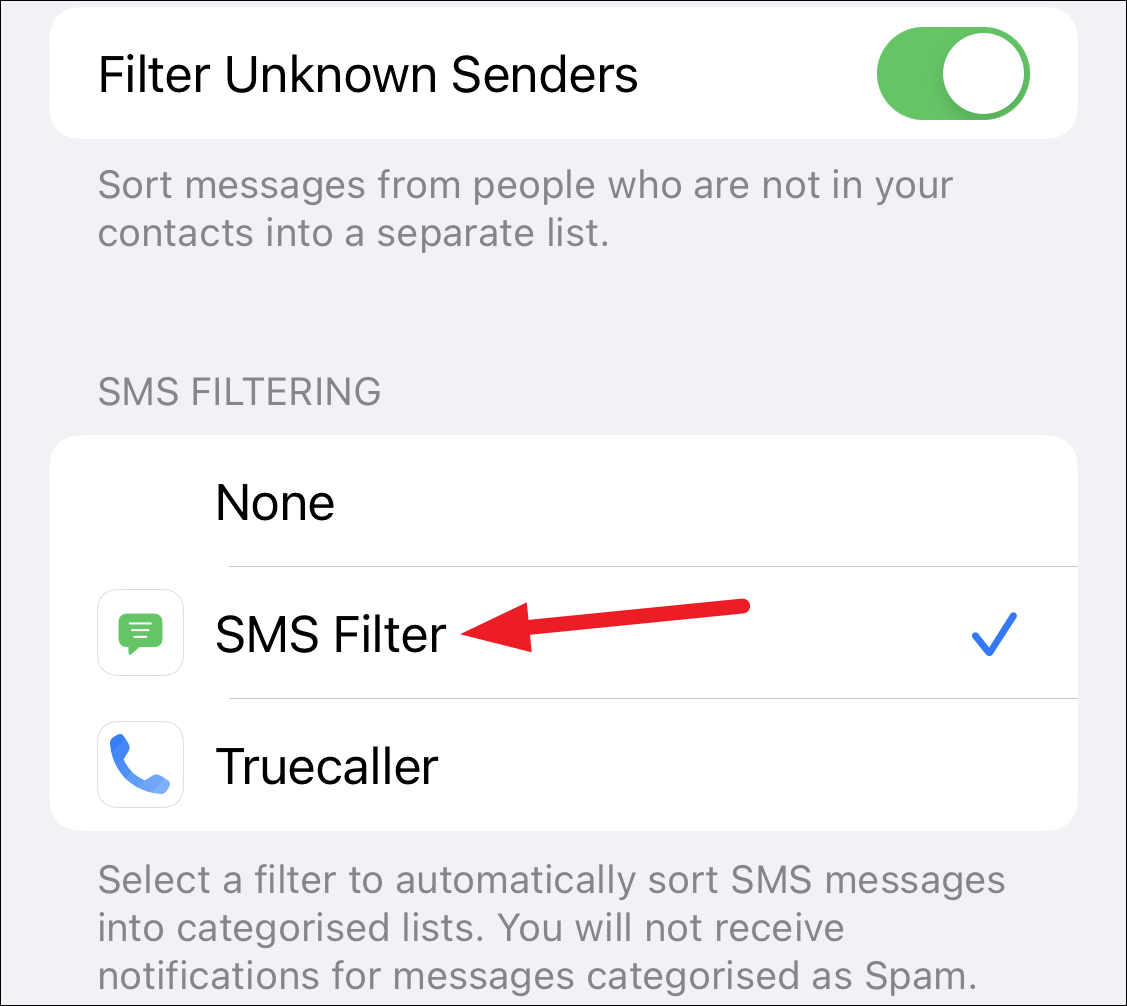 When you use a third-party service for filtering, you’ll have to select the option for SMS Filtering manually. Although most apps would guide you themselves, here’s what you need to do. Go to ‘Messages’ from the Settings apps and scroll down to the ‘Unknown & Spam’ setting for Messages. Then, tap the app’s filter to select it for SMS Filtering.