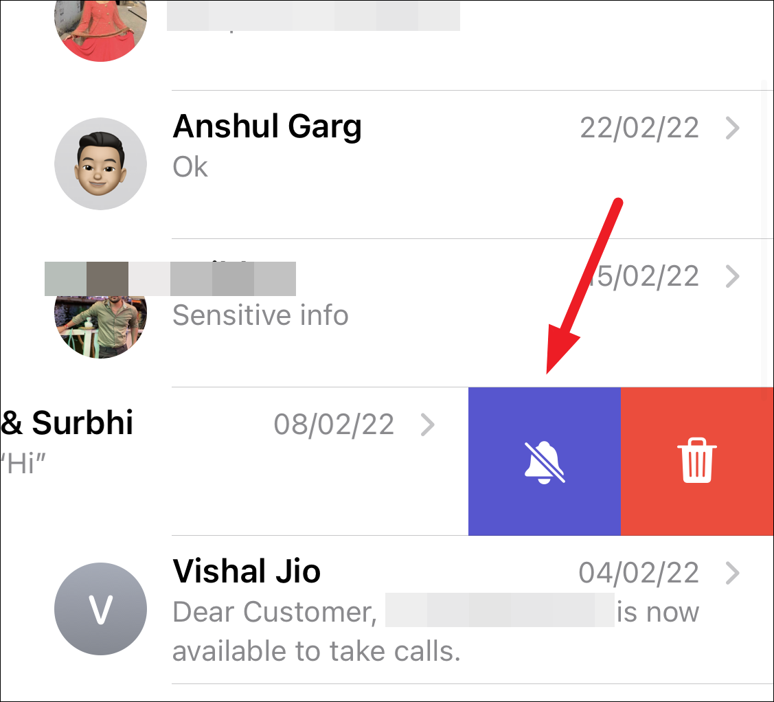 Open the Messages app and scroll to the conversation you want to mute. Swipe left on the conversation and tap the ‘Bell’ icon.