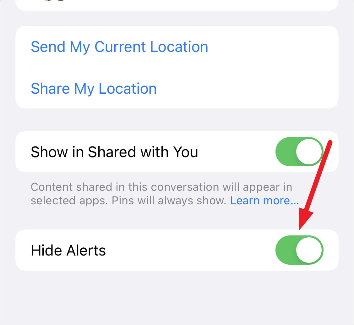 You can also open the conversation and tap the ‘People’ icon at the top. Then, enable the toggle for ‘Hide Alerts’.