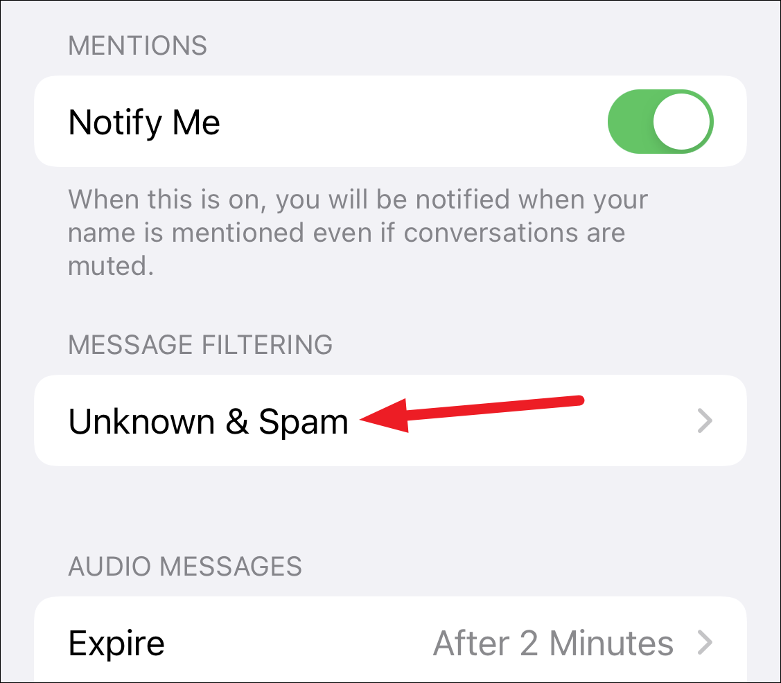 Scroll down in message settings and tap ‘Unknown & Spam’.