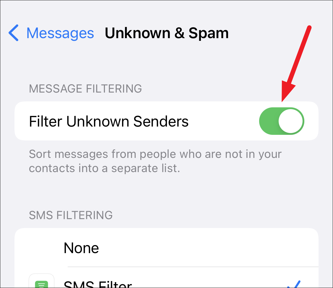 iPhone has an in-built spam filtering for messages from unknown senders. When you enable it, you won’t receive notifications for messages from senders who aren’t in your contacts. iPhone will separate the messages from unknown senders into a different folder.