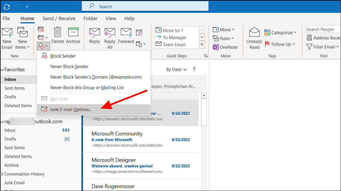 - In the Outlook app, under the 'Home' tab, click 'Junk', and select 'Junk E-mail Options'.