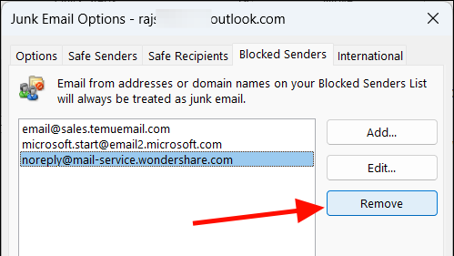 - Next, navigate to the 'Blocked Senders' tab. Thoroughly check the list to verify that it only contains companies and individuals you purposefully blocked. Should you see any addresses that were unintentionally added to the block list, select them and click the 'Remove' button to restore their emails to your inbox.