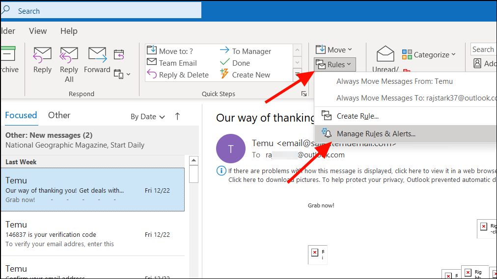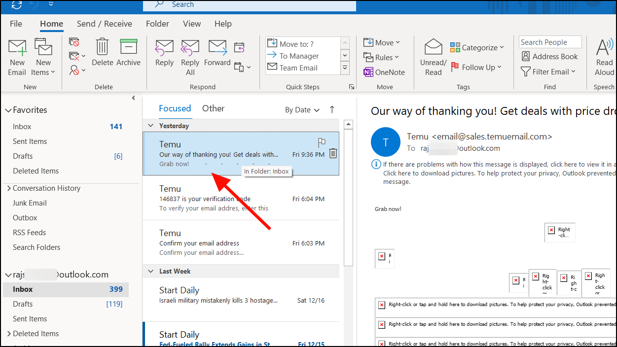 - If you're using Outlook on the web, check the box next to the Temu mail.