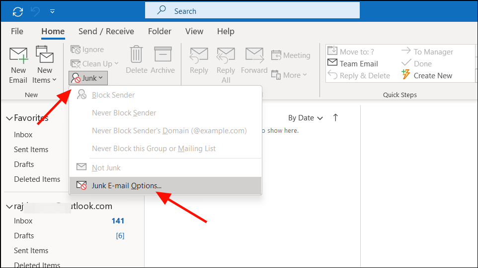 - Go to the 'Home' tab, click the 'Junk' button, and select 'Junk E-mail Options..'