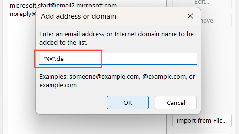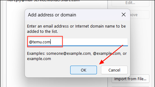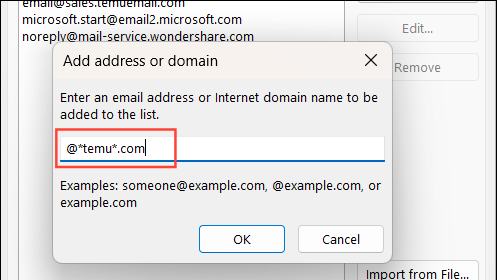 - Enter the domain all the domain names you see on the spam emails like @temu, @temu.de, etc., and click 'OK'.