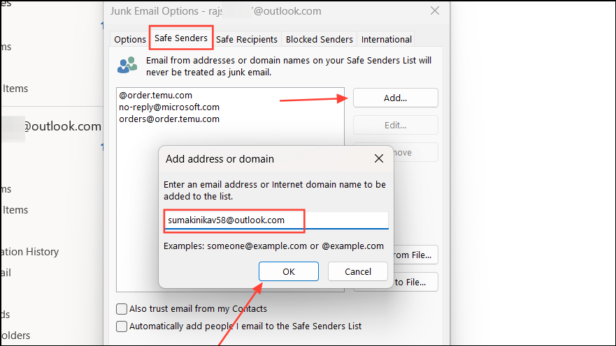 - To add people or domains to the Safe Senders lists, switch to the 'Safe Senders' tab in the same Junk Email Options dialog box.