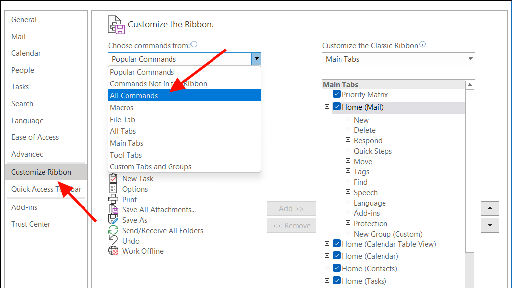- In the Outlook Options window, go to the 'Customize Ribbon'. Then, select 'All Commands' from the Choose commands from' drop-down menu.