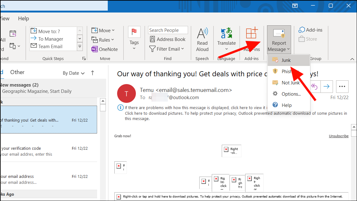 Outlook has a built-in feature that allows you to carefully block emails from specific senders, groups, domains, or even entire countries. It acts as a personalized spam filter, blocking unwanted messages from reaching your inbox. Temu spam may use a different email address each time but the domain name might remain the same like dkmarket125@temu.com, hkmarket652@temu.com.