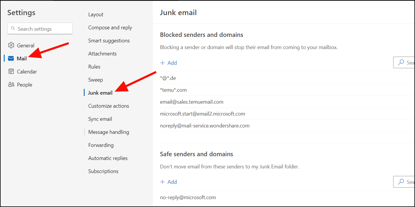 - In the Settings window, go to the ‘Mail’ section, and click the ‘Junk email’ option.