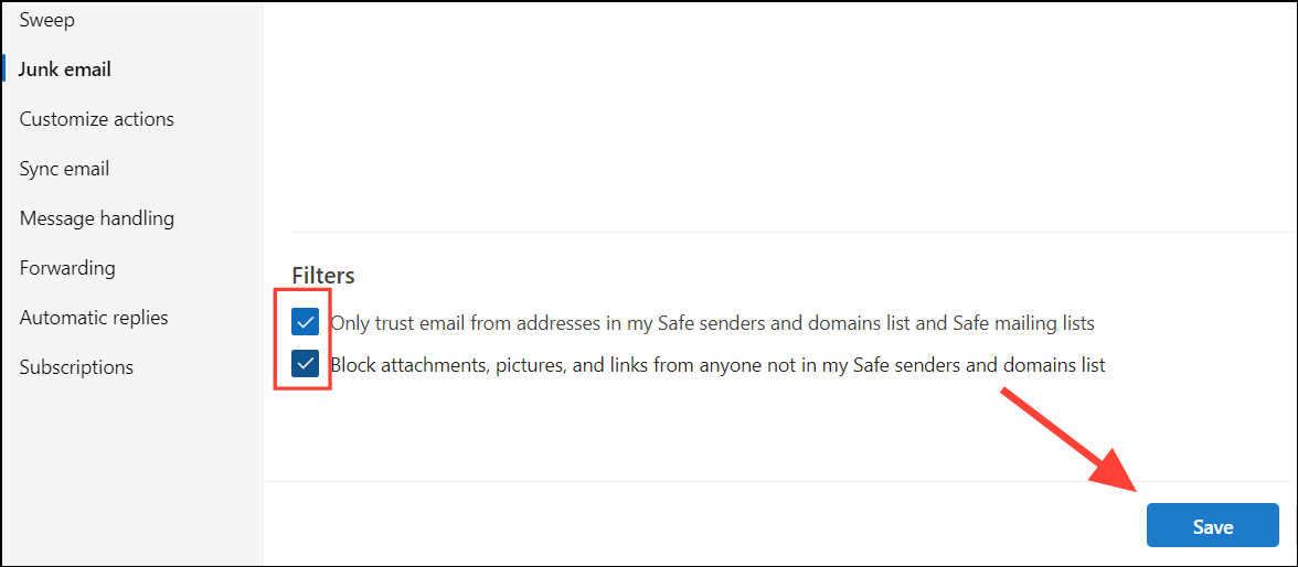 - Safe Lists Only: This option offers the strictest spam protection. Only emails from your Safe Senders and Safe Recipients lists will reach your inbox. All other emails, including legitimate ones, will be moved to the Junk folder.