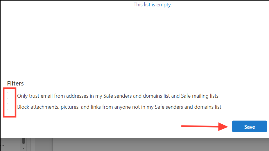 - You also have two more options to configure options to configure the Safe Senders lists:
