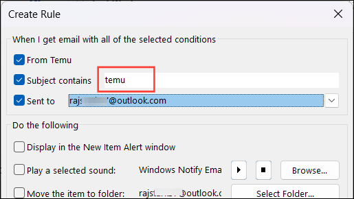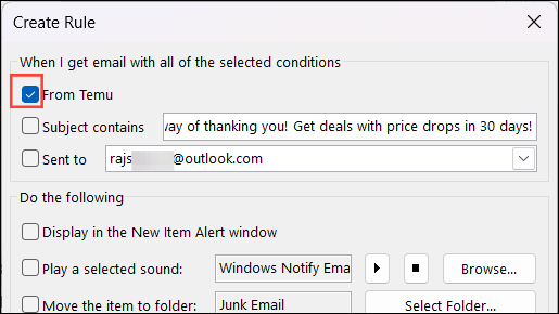 - In the Create Rule window, Outlook automatically prefills the details based on your selected email. Just tick the boxes next to the fields you want to use. You can edit any field to customize your rule.