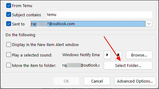- On the same window, under the 'Do the Following', choose where you want to move the spam. Click the 'Select Folder' button.