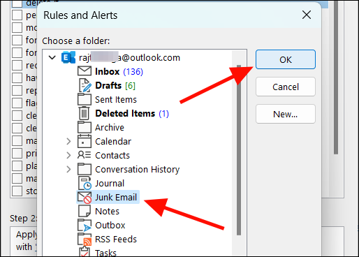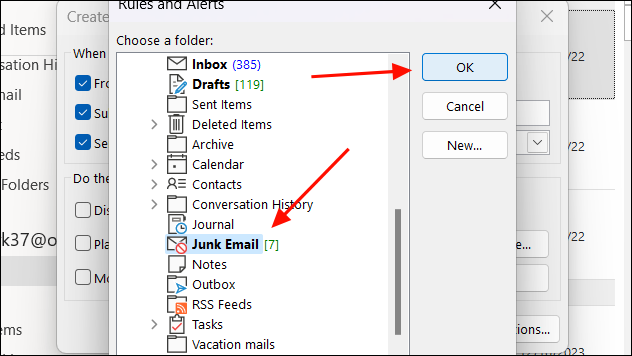 - Select the 'Junk Email' folder or a custom folder, and click 'OK'.