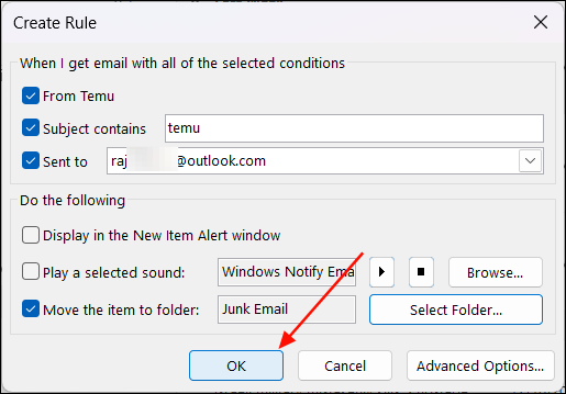 - Select the folder where you want to move the email i.e., Junk Email, and click 'OK'.