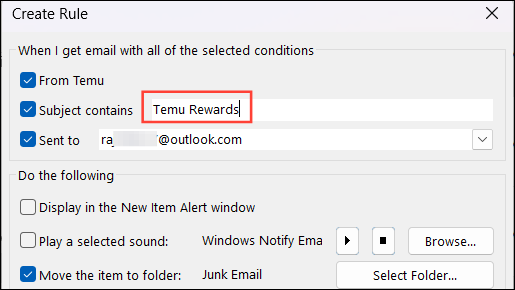 For example, if you created a rule that contains the keywords 'Temu Rewards' in the Subject, emails with subjects like "Rewards Temu", "TemuRewards", "Rewards from Temu," or just "Rewards" will not trigger the rule.