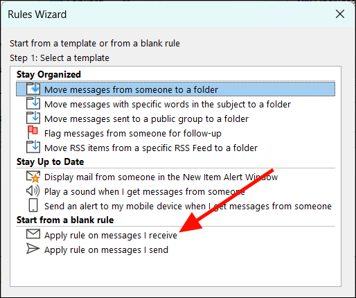 - The Rules Wizard will open and show you lists of templates and options to start from a blank rule. Click the 'Apply rule on messages I receive' option under Start from a blank rule and click 'Next'.