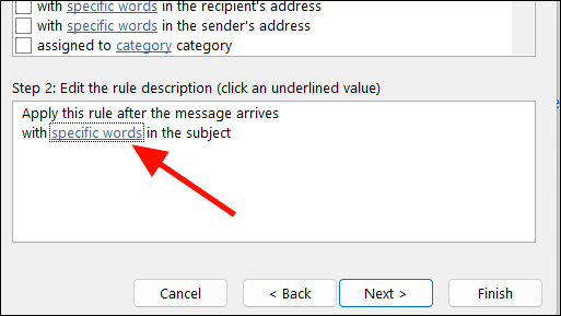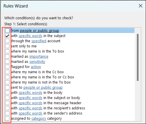 - In the Rule Wizard window, choose the condition(s) you want to apply to the rule. For example, to check mails 'with specific words in the subject', 'with specific words in the message header', etc. When you select multiple conditions, the rule will only trigger if all of those conditions are met.