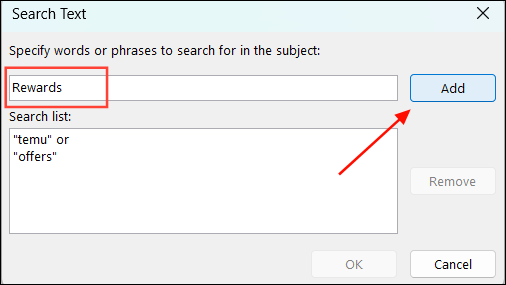 - Now, enter the keywords or phrases you want to check for in potential spam emails. Unlike the previous method, you can add as many keywords as needed. The rule will scan for any of these keywords within the subject line, and Outlook will filter the email if even one keyword is found. Enter your keywords one by one in the text field and click the 'Add' button. Once you're done adding the key, click 'OK'.