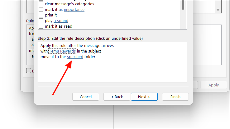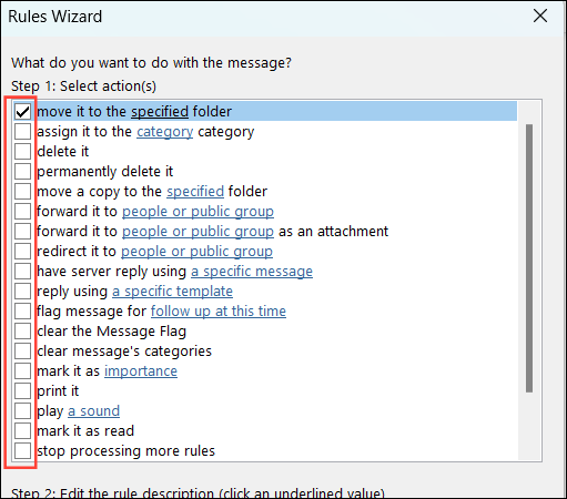 - If you choose to move the email, click on the 'specified' hyperlink in the below box.