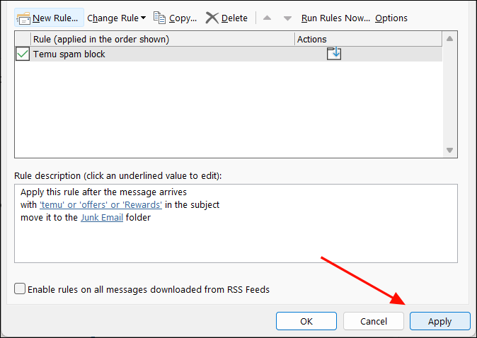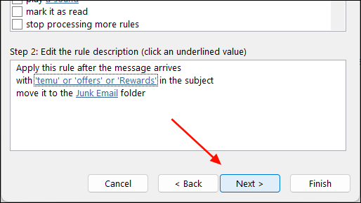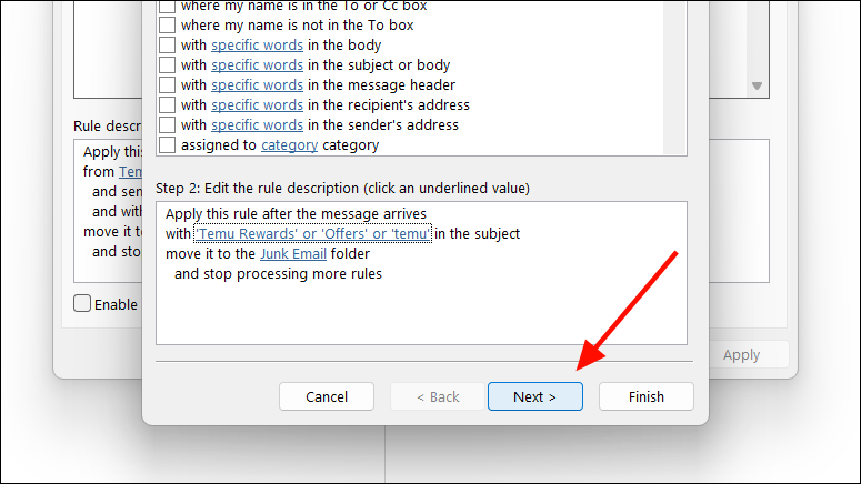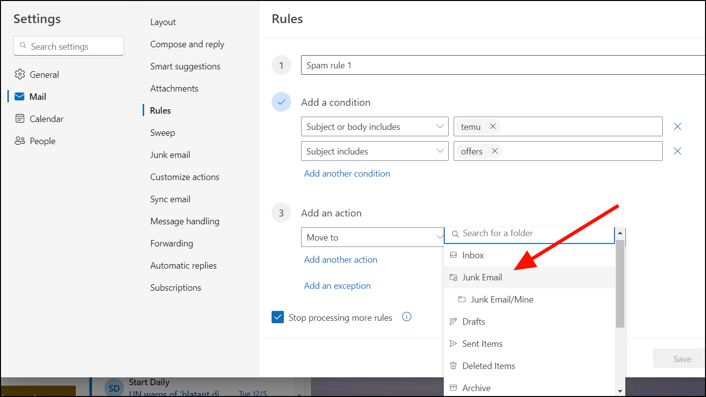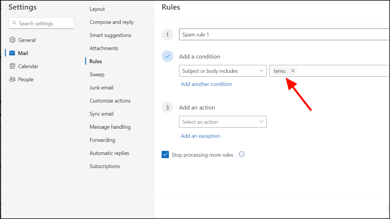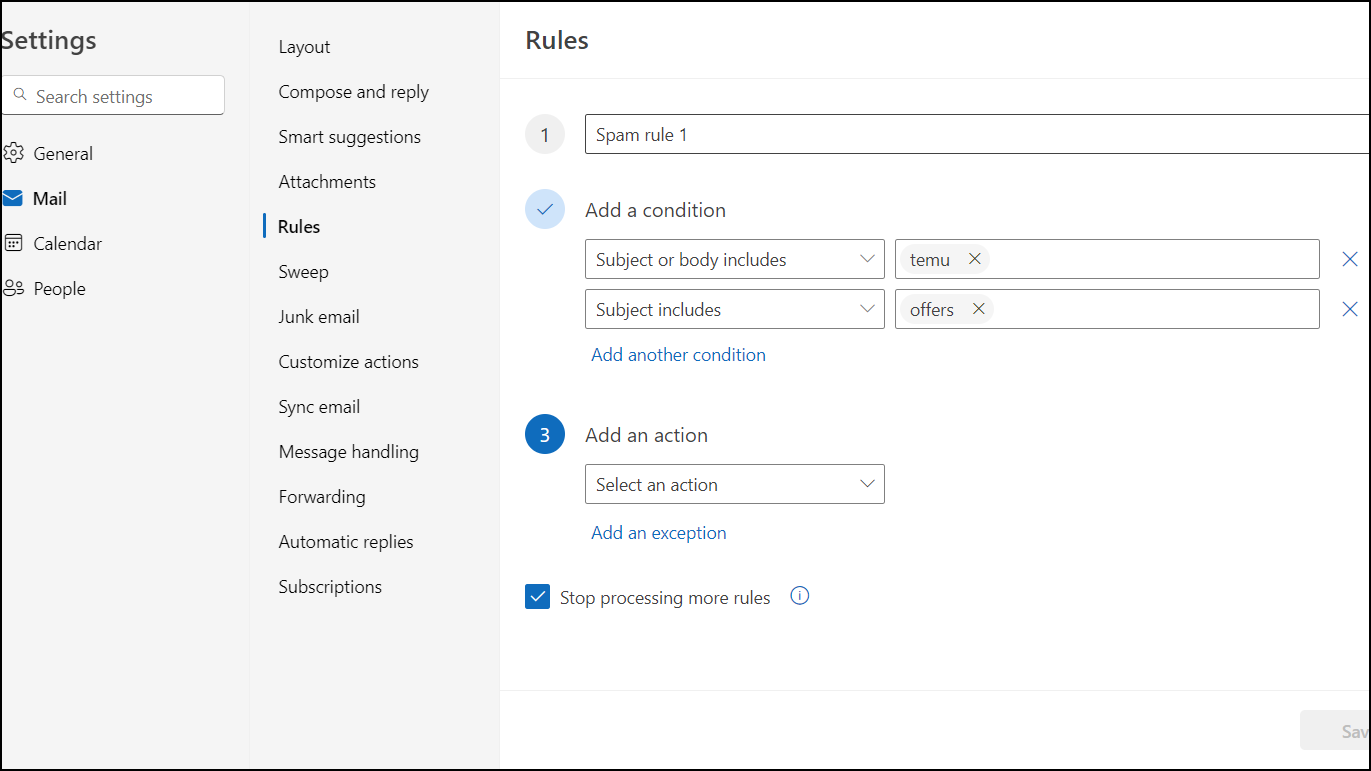 As I mentioned before, creating one rule won't be enough, you need to create multiple rules to fight the spam. As new spam emails bypass your existing filters, create more rules to target specific keywords, senders, domains, subject lines, or other relevant conditions.