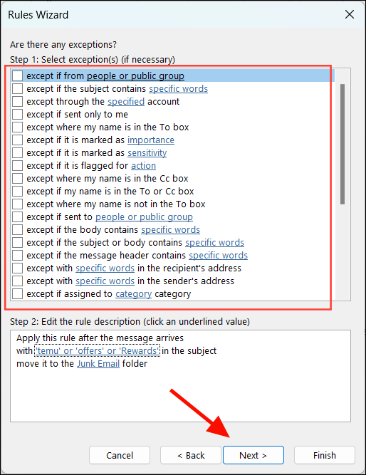 - Next, you can set an exception if required and click 'Next'. You can set exceptions to emails from specific people in your contacts even if those emails match the conditions by selecting the 'except if from people or public group' option.