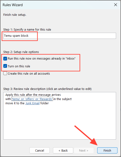 - Finally, give a name to your rule, verify the settings of the rule, and click 'Finish' to create the Rule. Before you do, tick the 'Run this rule now on messages already in "inbox"' to check your inbox. Then, make sure the 'Turn on this rule' option is checked.