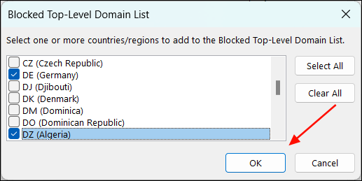 - In the pop-up window, select the countries or regions you want to email from and click 'OK'. For instance, some users have reported that they repeatedly get spam emails that end with '.de' (country code top-level domain for Germany).