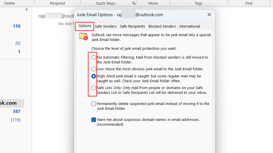 - Once the Junk E-mail Options wizard opens, in the ‘Options’ tab, you can choose the level of junk email protection from the options given below: