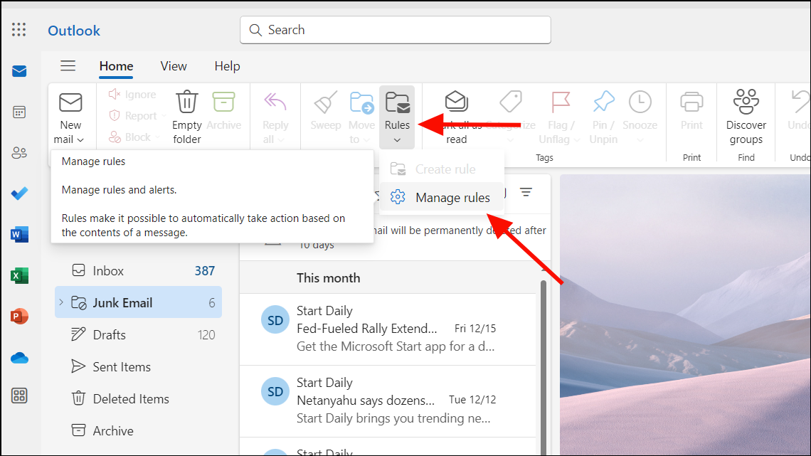 There are two ways to create rules for blocking spam in Outlook. You can select an existing junk email and Outlook helps you create rules based on its sender, subject, or keywords, letting you apply those rules to similar messages with ease. Or, you can fully create custom rules from scratch, defining exactly how you want Outlook to handle specific types of junk.