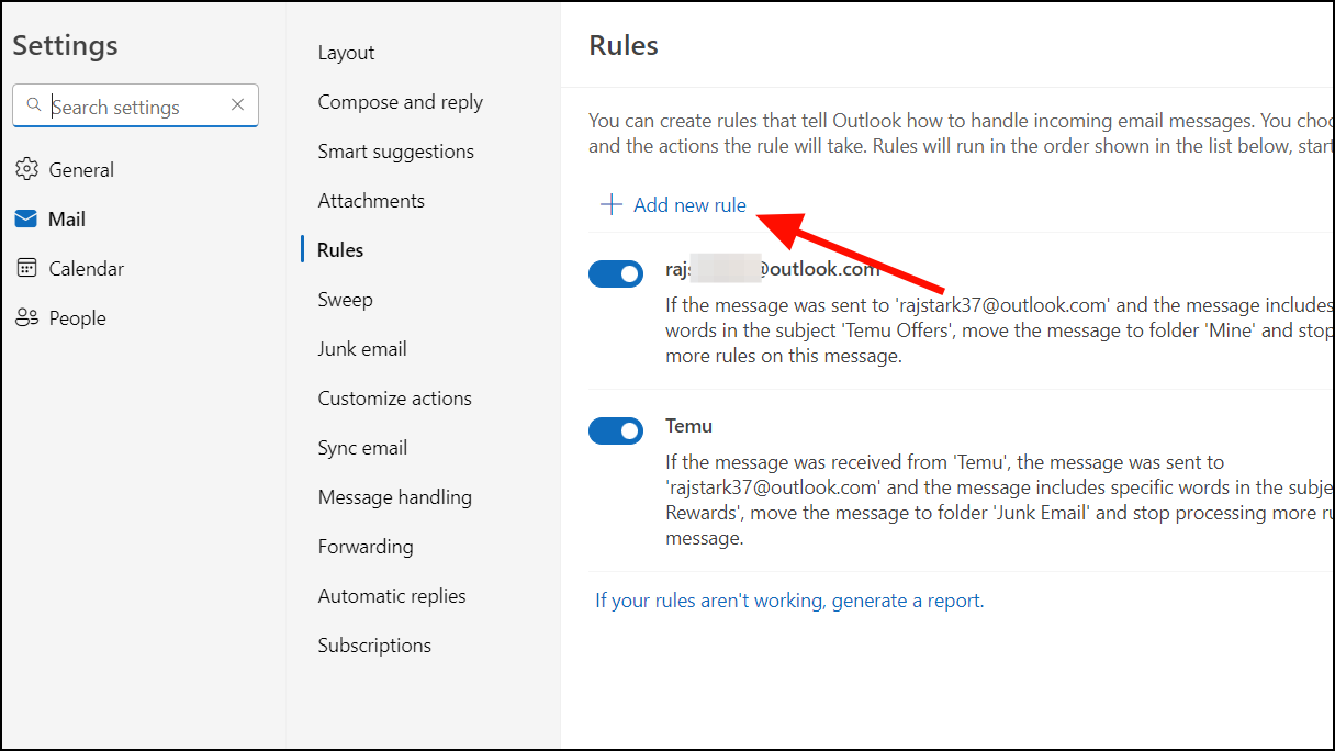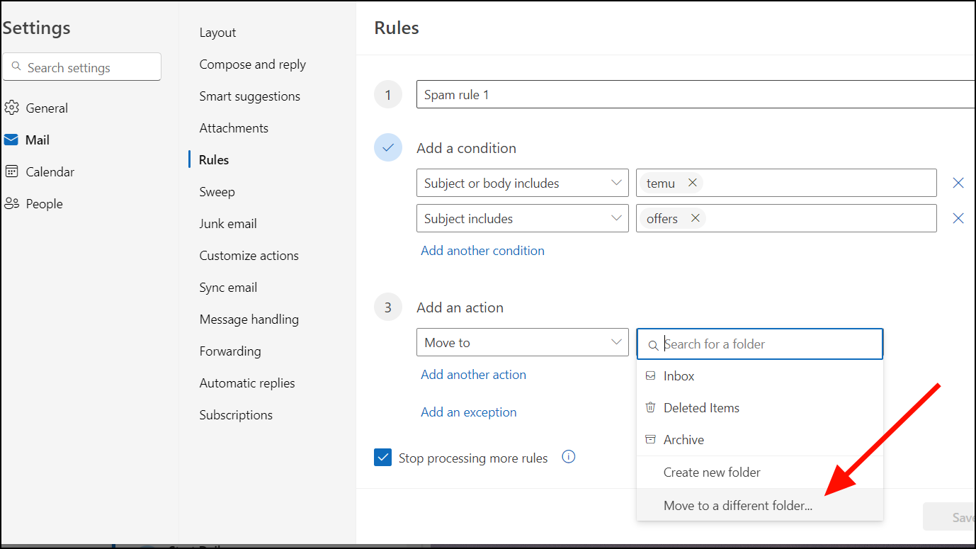 Creating one rule won't be enough, you need to create multiple rules, each rule should target specific criteria, such as keywords in the subject line, senders like 'Temu' or 'Keto VIP', or other relevant conditions. Here's how: