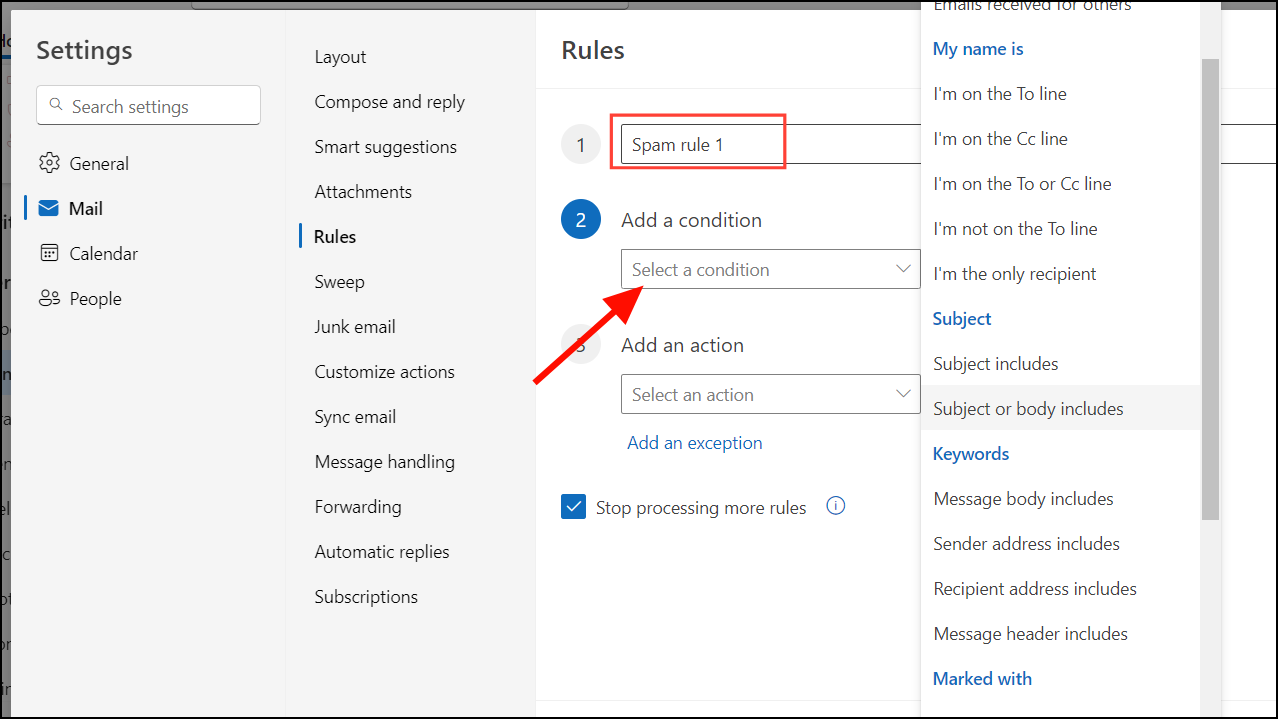 - Type a name for your rule, and choose a condition from the ‘Select a condition’ drop-down like 'Subject or body includes'.