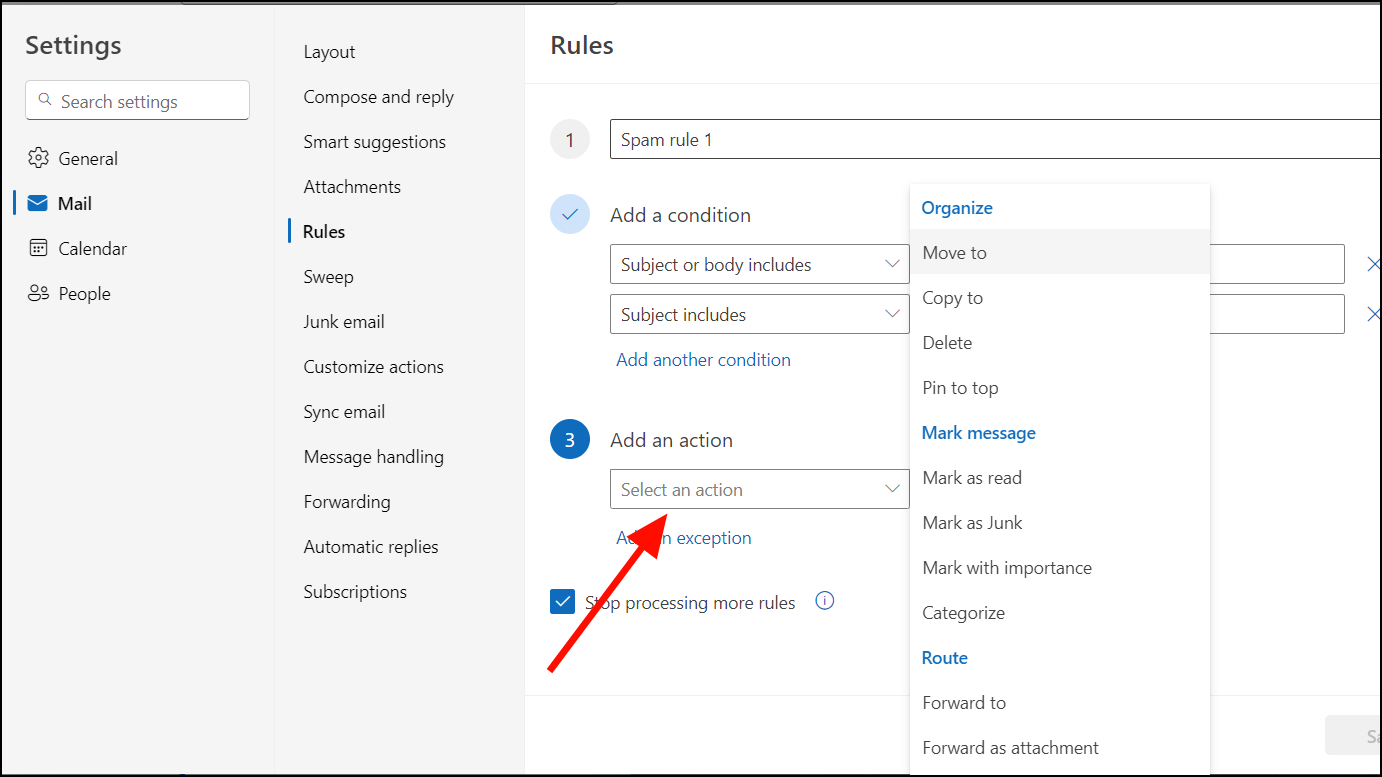 - From the ‘Select an action’ drop-down, choose what you want to do with email such as move it, or delete it.