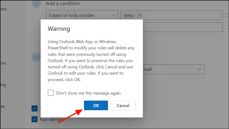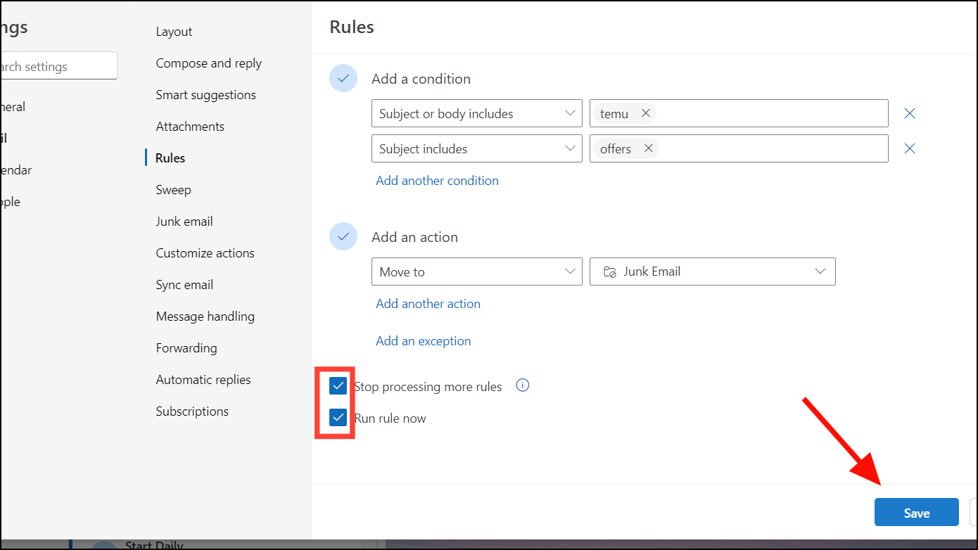 - After that, check the ‘Run rule now’ option and click ‘Save’.