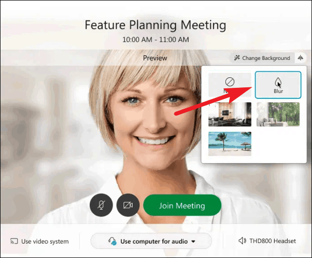A menu with a few options will expand. Choose ‘Blur’ from the menu to blur your background. You can also select an image from the preset images to entirely replace your background. But if you like to keep things simple, ‘Blur’ is the perfect choice for you.