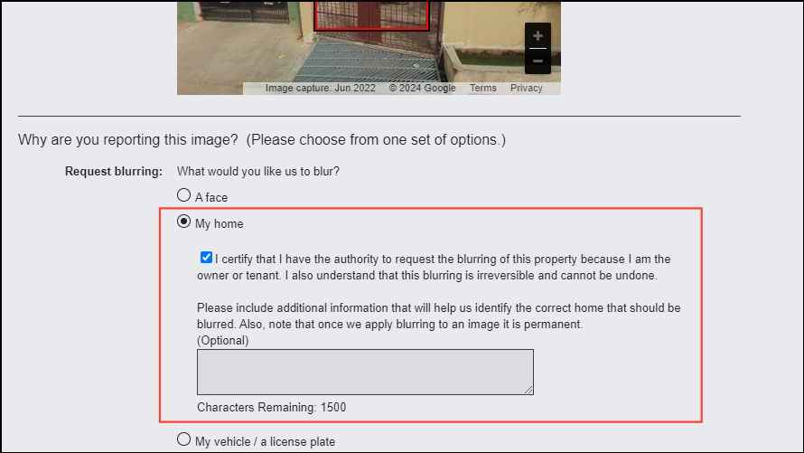 - If you decide to blur your entire home, you will need to click on a checkbox certifying that you are the tenant or owner of the property. You can also provide additional details to explain what you are blurring.