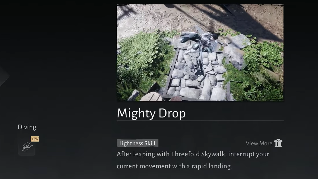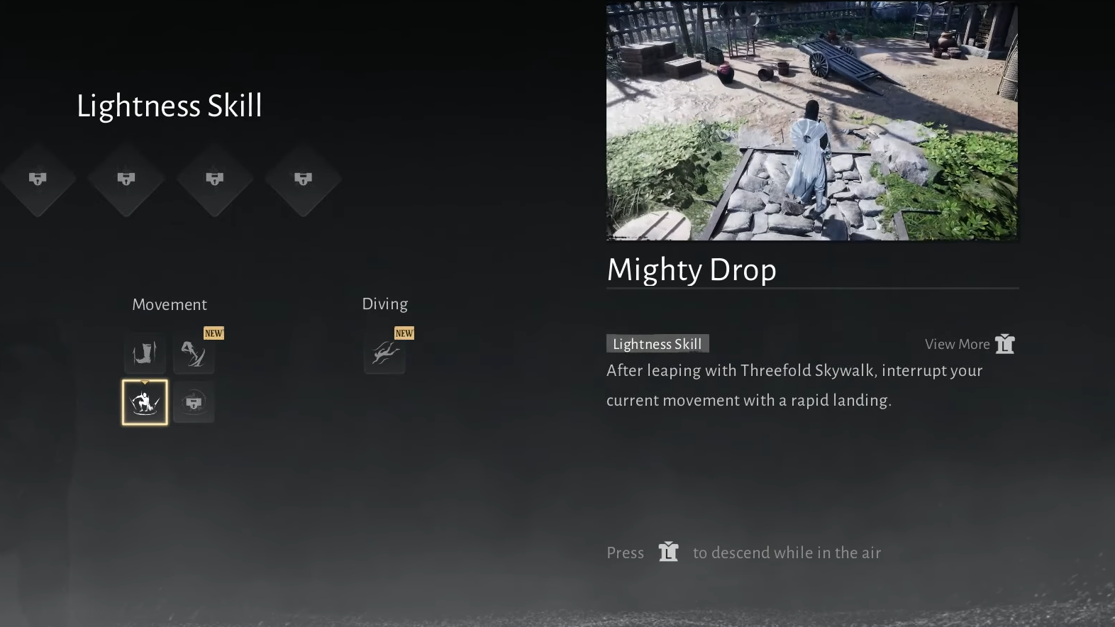 Step 2: In Movement Mystic Skills, locate the slam move described as Mighty Drop. Highlight it to see the control hint that explains how to “descend while in the air” on your current platform.