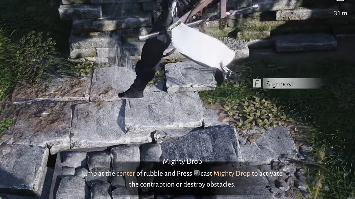 Step 3: While still in mid-air over the slab, press the Mighty Drop input (left trigger on controller, or Q on PC). Your character should slam downward onto the stone.