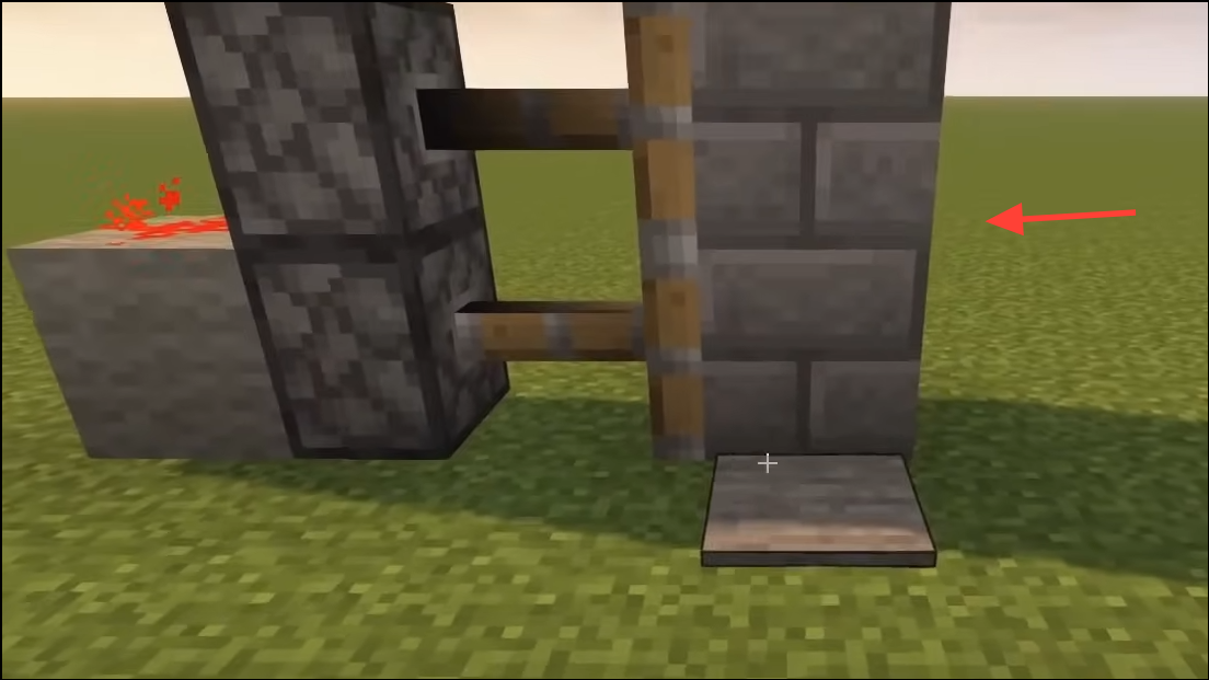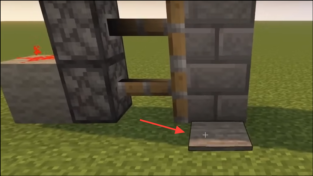 Step 8: Put one pressure plate centered in front of the doorway and one behind it. Connect each plate to the pit’s Redstone dust line, then cover the wiring with blocks and test that walking on either plate retracts the pistons to open the passage.